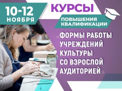 В период с 10 ноября по 12 ноября 2025 года пройдут курсы повышения квалификации «Формы работы учреждений культуры со взрослой аудиторией». Длительность программы составляет 24 академических часа. Обучение пройдет в заочном