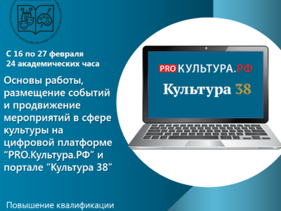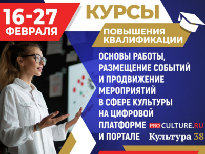 С 16 по 27 февраля 2026 г. пройдут курсы по дополнительной программе повышения квалификации «Основы работы, размещение событий и продвижение мероприятий в сфере культуры на цифровой платформе PRO.Культура.РФ и портале „Культура 38“»