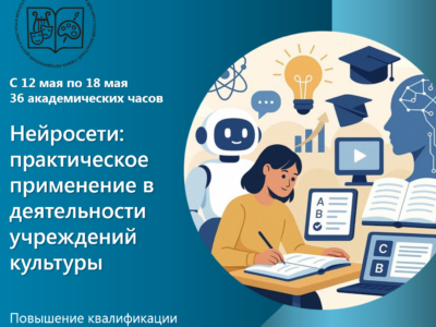 С 12 по 18 мая 2026 г. приглашаем специалистов учреждений культуры и искусства принять участие в обучении по дополнительной профессиональной программе «Нейросети: практическое применение в деятельности учреждений культуры». Программа направлена