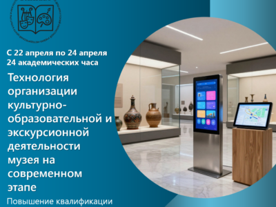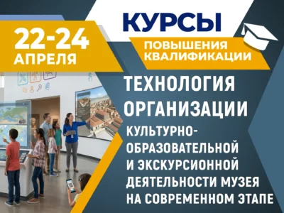 С 22 по 24 апреля 2026 г. пройдут курсы повышения квалификации по программе «Технология организации культурно-образовательной и экскурсионной деятельности музея на современном этапе»
