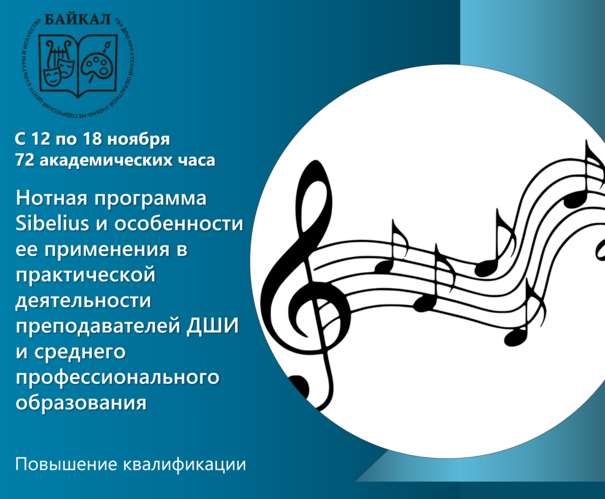 Приглашаем преподавателей ДШИ и средних профессиональных образовательных организаций пройти обучение по дополнительной профессиональной программе повышения квалификации «Нотная программа Sibelius и особенности ее применения в практической деятельности преподавателей ДШИ и среднего профессионального образования» (36 академических часов).