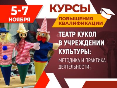 В период с 5 ноября по 7 ноября 2025 г. пройдут курсы повышения квалификации «Театр кукол в учреждении культуры: методика и практика деятельности». Длительность программы составляет 24 академических часа. Обучение