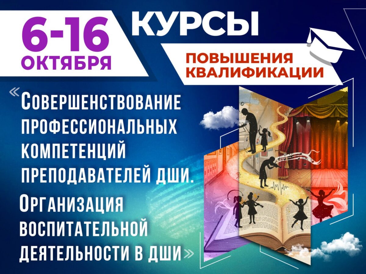 С 6 октября по 16 октября 2025 г. приглашаем преподавателей дополнительного образования детей в сфере культуры и искусства принять участие в обучении по программе повышения квалификации «Совершенствование профессиональных компетенций преподавателей ДШИ. Организация воспитательной деятельности в ДШИ». Объем программы составляет 72 академических часа.