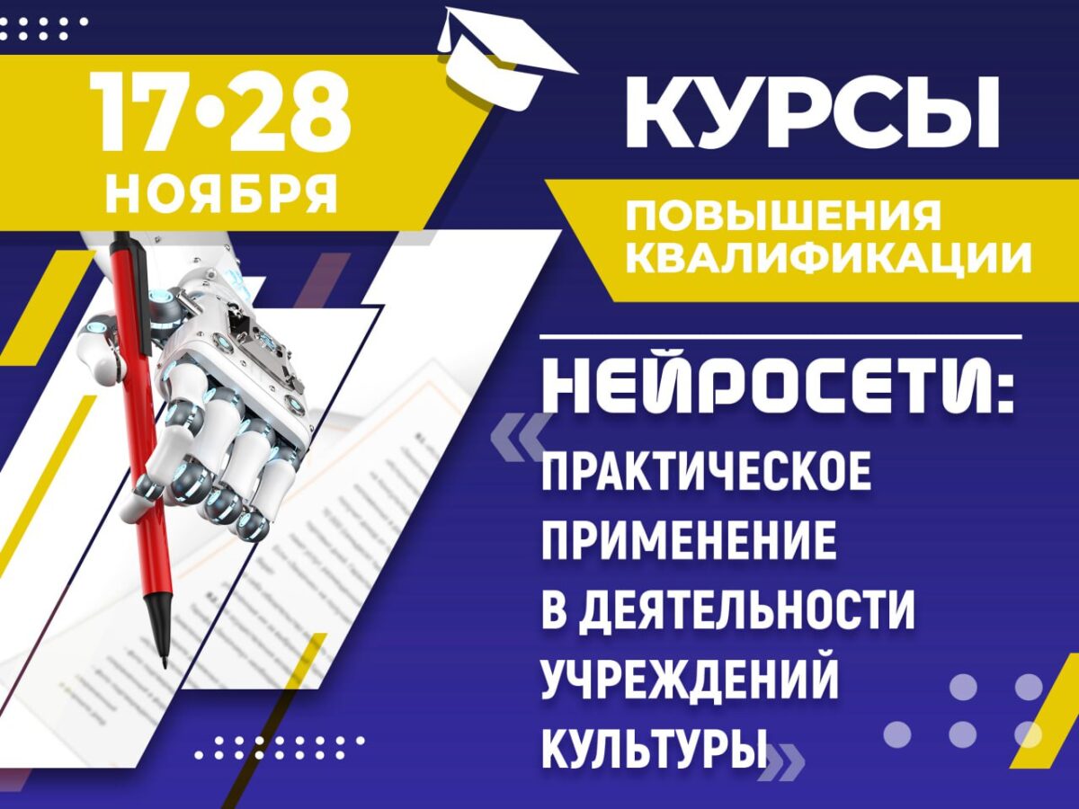 С 17 ноября по 28 ноября 2025 г. приглашаем руководителей, заместителей руководителей, специалистов учреждений культуры и искусства, преподавателей среднего профессионального и дополнительного образования детей принять участие в обучении по дополнительной профессиональной программе «Нейросети: практическое применение в деятельности учреждений культуры».